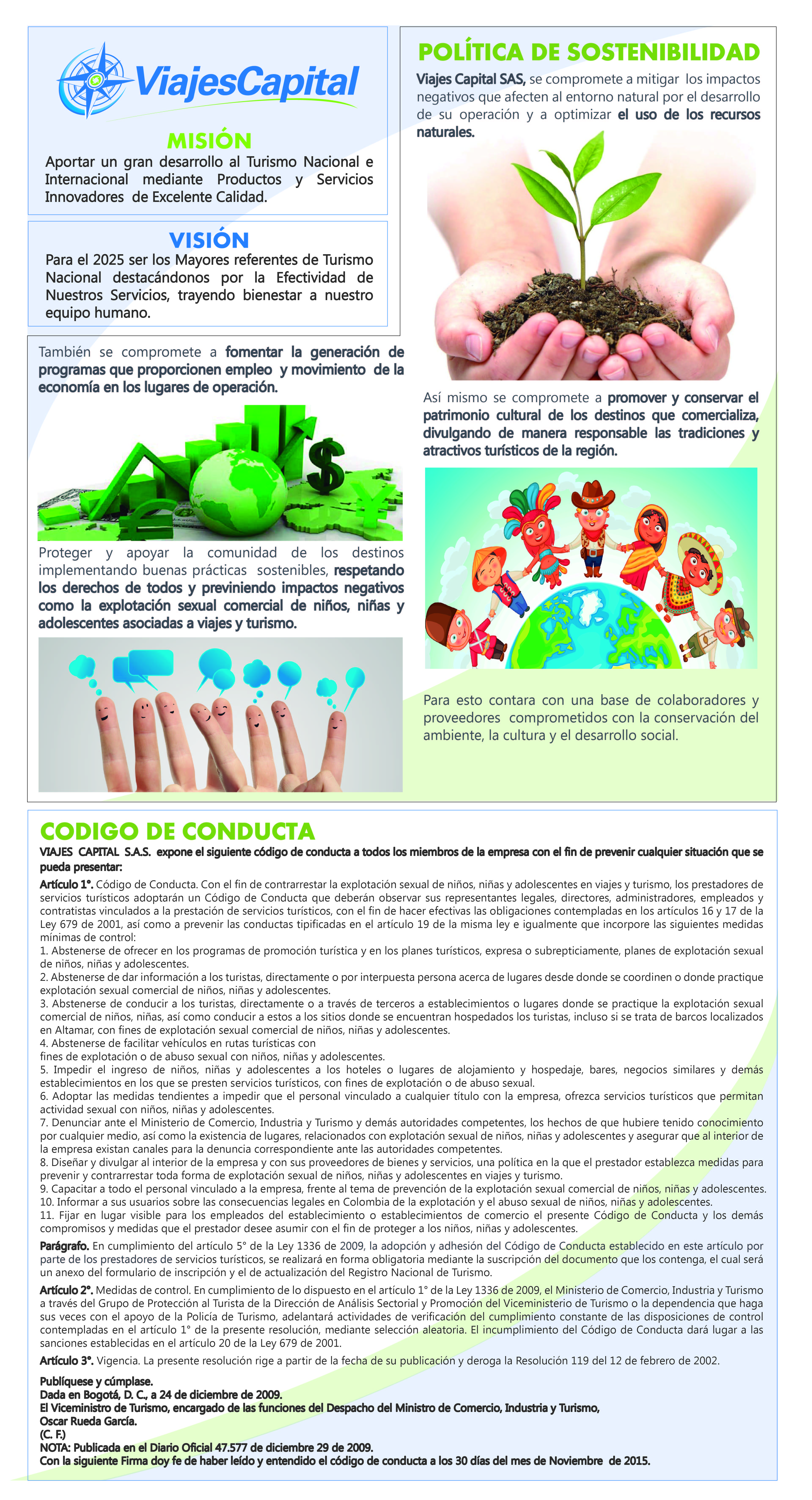 Rechazamos la explotación, la pornografía, el turismo sexual y demás formas de abuso sexual con menores. Contribuimos al cumplimiento de la ley 679 de 2001, y la ley 1336 de 2009. Nos acogemos a la Ley 17 y 1333 para evitar el tráfico ilegal de especies de flora y fauna. Ley 63 1986, Ley 1185 de 2008 para evitar el tráfico de bienes culturales. Nos acogemos a la resolución 0584 de 2002 por la cual se declaran y protegen las especies silvestres amenazadas en el territorio nacional.